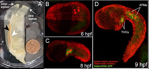A. Ciona robusta adult with penny for scale. B-D. Early developmental stages of the Ciona robusta embryo highlighting the epidermis in red and the cells that give rise to heart and muscle lineages highlighted in green with red nuclei.